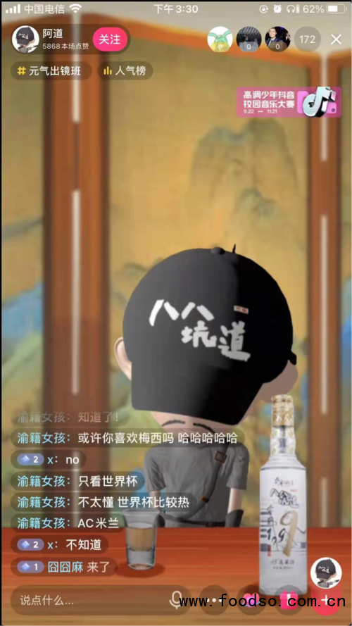 為精準定位廣大中青年男性群體,直播中還引入相聲和足球這兩個喜聞樂見的大眾話題?!鞍⒌馈痹谄放浦辈ブ性黾恿嗣摽谛愦髸阈ζ魏偷略粕缛宋稂c評等內容,并順勢引入酒文化相關概念,爆笑輕松的氛圍滿足了直播間觀眾的娛樂需求,吸引了大量粉絲的同時,深化了品牌影響力。另外,“阿道”談及世界各地足球風云事件,更觸動中青年男性情懷,使用足球與美酒這一對黃金搭配,令八八坑道品牌印象深入人心。