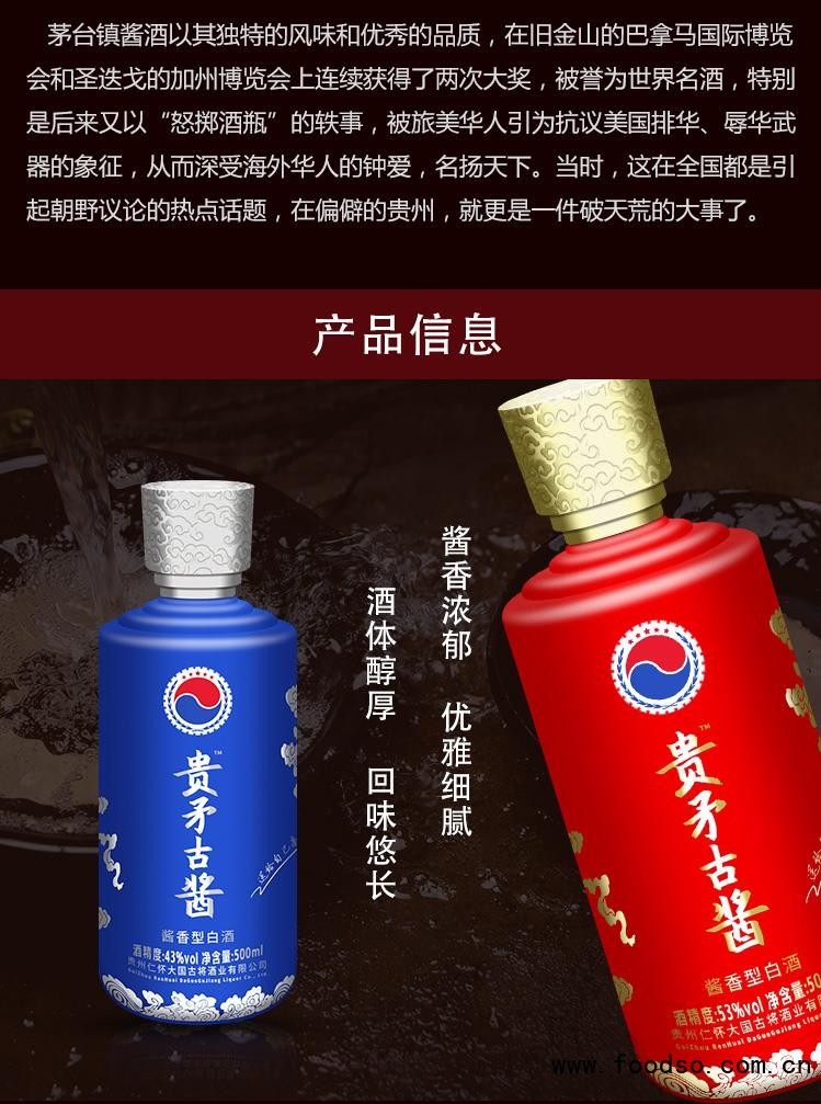 貴州省仁懷市大國古將酒業(yè)有限公司是集釀酒、包裝、銷售為一體的酒業(yè)公司,公司負(fù)責(zé)人楊蔚然(楊酒師),楊酒師承楊家釀酒秘方及技術(shù),經(jīng)過三十多年釀酒實(shí)踐、研究,特別擅長生產(chǎn)醬香酒;還發(fā)明了柔順醬香生產(chǎn)工藝(并獲得了國家專利);公司擁有茅臺鎮(zhèn)白酒生產(chǎn)許可證、擁有多條自動灌裝生產(chǎn)線、擁有質(zhì)量檢測中心,還擁有醬香酒釀酒生產(chǎn)基地;其中醬香酒釀酒基地與茅臺酒廠隔河相望,直線距離1.5公里,享有得天獨(dú)厚的國酒醬香生產(chǎn)優(yōu)勢;釀酒基地有航車釀酒車間3個(gè),手工釀酒車間1個(gè),酒庫存有1000斤一一壇的醬香老酒一千 多壇,還存有50噸至300噸的罐裝老酒60多罐,近一萬噸:貴矛小將、大將、古醬產(chǎn)品包裝設(shè)計(jì)新穎獨(dú)特,以高品質(zhì)、高顏值、低價(jià)格具有競爭優(yōu)勢與品鑒、收藏價(jià)值。近年來,楊酒師為省內(nèi)外多家酒廠。酒業(yè)公司提供技術(shù)指導(dǎo),公司對外提供散裝原酒老酒,提供專業(yè)貼牌生產(chǎn),提供單位私人定制等服務(wù)。